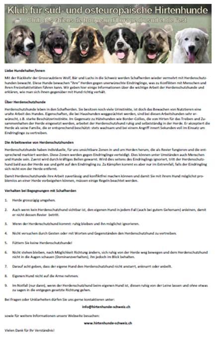 Der Klub Süd- und Osteuropäischer Hirtenhunde ( KSOH) bietet allen Mitgliedern einen Rechtsschutz an und fördert die Eigeninitiative , um geeignete HSH-Arbeitshunde verantwortungsbewussten Tierbesitzern anbieten zu können . Wir fordern zudem auch die staatliche Anerkennung privater HSH-Rassen aus ursprünglichen Arbeitslinien . Das wichtigste Kriterium müsste eigentlich der Erfolg der Arbeitsleistung der HSH sein, die Verhinderung von Wolfsrissen sowie die Verträglichkeit mit den Menschen in unserer engen Schweiz .