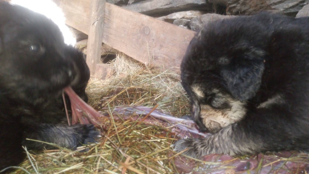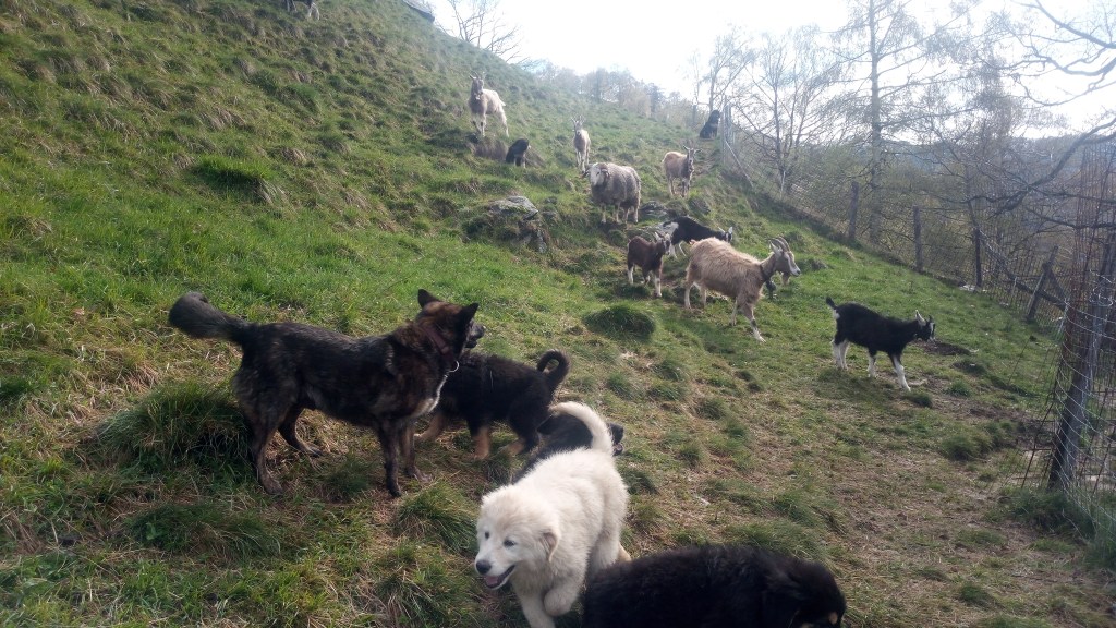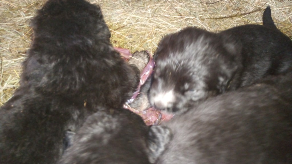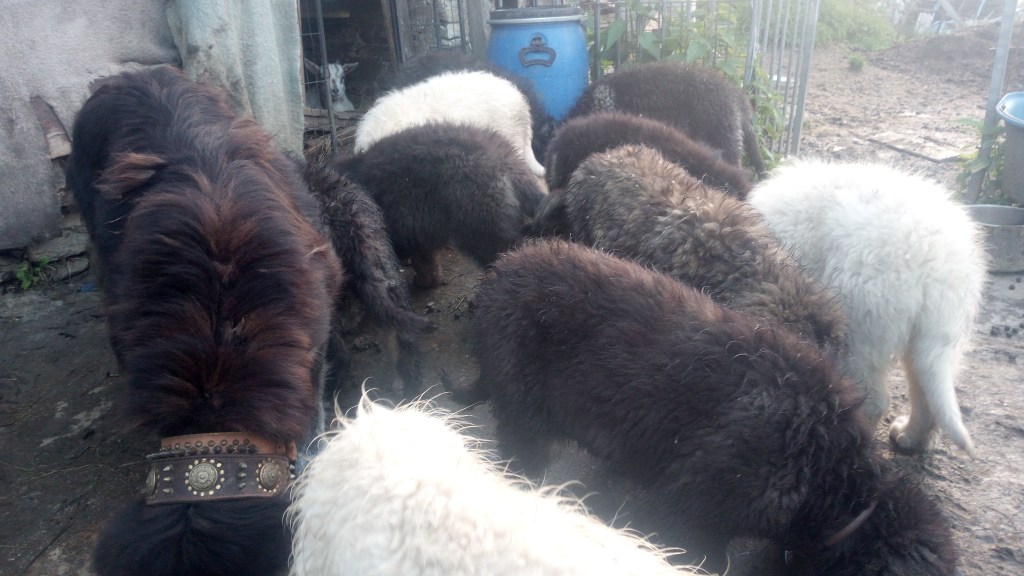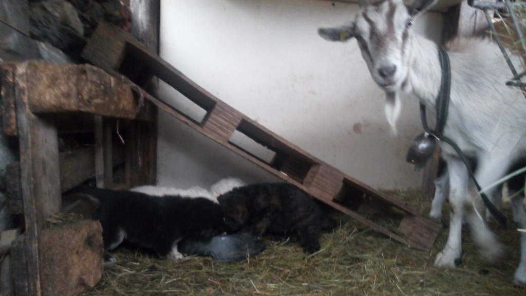 Als erste Nahrung ausser der Muttermilch bewährt sich Ziegenmilch um anzufüttern. Die Welpen lernen schnell dass ihre Milch vom Melken der Ziegen kommen und sind bald dabei ungeduldig am warten auf ihre Portion.