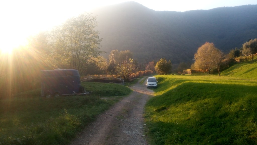 100 m nach dem grossen Stall auf dem Foto oberhalb kommt der Parkplatz von Caneggio . Von da geht es auch mit dem Auto noch gut 300 Meter auf der Via Campora „ai vign“ bis zum Waldweg der beim blauen Vehtransporter anfängt und rund 200 m runter bis zum ersten Weidezauntor zum Stall runterführt. Ich werde sie natürlich oben beim Dorfparkplatz abholen kommen und sie ins Hundeterritorium einführen .
